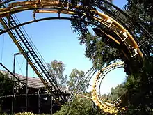 Python's double-corkscrew element (chain lift and first drop in background)