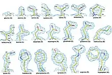 There are 3 types of alpha-helices and with nearly identical molecular structure, namely: a) 1.5Å per amino acid rise, b) 100˚ per amino acid turn, c) 3.6 amino acids and 360˚ per helical turn, and d) 5.4Å per helical turn. The 3 types of alpha-helices are: 1) mostly hydrophobic amino acids including Leucine (L), Isoleucine (I), Valine (V), Phenylalanine (F), Methionine (M) and Alanine (A) that are commonly found as the helical transmembrane segments in membrane proteins; 2) mostly hydrophilic amino acids including Aspartic acid (D), Glutamic acid (E), Glutamine (Q), Lysine (K), Arginine (R), Serine (S), Threonine (T), Tyrosine (Y) that are commonly found on the out layer in water-soluble globular proteins; 3) mixed hydrophobic and hydrophilic amino acids that are partitioned in 2 faces: hydrophobic face and hydrophilic face, in an analogy, like our fingers with front and back. These alpha-helices sometimes attach to surface of membrane lipid bilayer, or partially buried to the hydrophobic core and partially close to the surface of water-soluble globular proteins.[2]