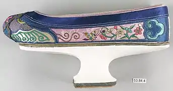 On the other hand, Manchu women wore a one-piece long dress.[1][3] However, they borrowed some elements from each other in the Qing dynasty, for example, wide robe sleeves which are typical features in the Han Chinese women's clothing was adopted in the informal daily outfits of the Manchu women.[6] Manchu women's clothing was therefore influenced by the Han Chinese clothing culture.[4] Manchu women also had natural feet and did not engage in foot binding as opposed to the Han Chinese women.[8]: 59