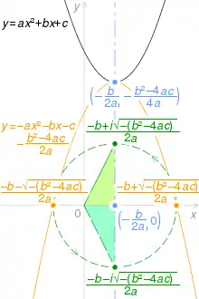 Visualisation of the complex roots of y = ax2 + bx + c: the parabola is rotated 180° about its vertex (orange). Its x-intercepts are rotated 90° around their mid-point, and the Cartesian plane is interpreted as the complex plane (green).[3]