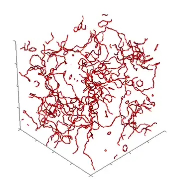 For temperatures low enough for quantum mechanical effects to govern the fluid, quantum turbulence is a seemingly chaotic tangle of vortex lines with a highly knotted topology, which move each other and reconnect when they collide. In a pure superfluid, there is no normal component to carry the entropy of the system and therefore the fluid flows without viscosity, resulting in the lack of a dissipation scale . Analogously to classical fluids, a quantum length scale (and the corresponding value in k-space ) can be introduced by replacing the kinematic viscosity in the Kolmogorov length scale with the quantum of circulation .[2] For scales larger than , a small polarisation of the vortex lines allows the stretching required to sustain a Kolmogorov energy cascade.