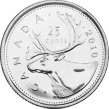 The quarter, short for quarter dollar, is a Canadian coin worth 25 cents or one-fourth of a Canadian dollar. It is a small, circular coin of silver colour. According to the Royal Canadian Mint, the official name for the coin is the 25-cent piece, but in practice it is usually called a "quarter", much like its American counterpart. In Canadian French, it is called a caribou or trente sous ("thirty sous", based on the old exchange rate).[1][2] The coin is produced at the Royal Canadian Mint's facility in Winnipeg, Manitoba.