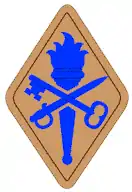 On a buff lozenge shaped field with rounded points, 2 inches (5.08 cm) in width and 3 inches (7.62 cm) in height overall, a blue (ultramarine) torch with blue flames surmounted by a blue key and blue sword crossed in saltire.