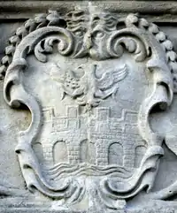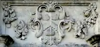 | Granville: Gules, three clarions or. For George Granville, 1st Baron Lansdowne of Bideford (1666-1735), nephew of John Granville, 1st Earl of Bath (1628–1701) and heir male of William Henry Granville, 3rd Earl of Bath (1692-1711).[45] It is the only escutcheon with heraldic supporters, generally reserved for use by nobility, here Two winged griffins rampant or. Above the escutcheon is a baron's coronet. He is identifiable by the style of his coronet and by his motto, shown inscribed on a scroll below: Deo, Patriae, Amicis[46] ("For God, my Country and Friends"), the motto of his uncle John Granville, 1st Earl of Bath having been: Futurum invisibile ("The future is unseen").[47] The arms are not those of John Granville, 1st Earl of Bath (1628–1701), or of his son Charles Granville, 2nd Earl of Bath (1661–1701). The latter's son William Granville, 3rd Earl of Bath (1692-1711) died aged only 19 two years before the building was completed in 1713. | ||||