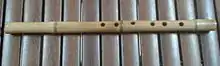 The quena (hispanicized spelling of Quechua qina,[1] sometimes also written kena in English) is the traditional flute of the Andes. Traditionally made of cane or wood, it has 6 finger holes and one thumb hole, and is open on both ends or the bottom is half-closed (choked). To produce sound, the player closes the top end of the pipe with the flesh between the chin and lower lip, and blows a stream of air downward, along the axis of the pipe, over an elliptical notch cut into the end. It is normally in the key of G, with G4 being the lowest note. It produces a very "textured" and "dark" timbre because of the length-to-bore ratio of about 16 to 20 (subsequently causing difficulty in the upper register), which is very unlike the tone of the Western concert flute with a length-to-bore ratio of about 38 to 20.