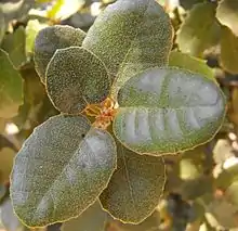 Island oak is a tree growing up to 20 metres (66 feet) in height.[5] The mature tree has a grayish to reddish brown trunk with scaly, furrowed bark.[3] The twigs are reddish and covered in woolly hairs. The leathery leaf blades are often concave and are an oblong lance shape or oval with pointed or rounded tips. The edges are smooth or toothed.[5] The upper surfaces are dark green and lightly hairy when new, losing the hairs over time. The undersides are gray-green and coated in woolly hairs, becoming less woolly with age.[3] They are usually 7 to 10 centimetres (2+34 to 4 inches) long, sometimes up to 12 cm (4+34 in). The acorn grows singly or in pairs. The cup has thick scales and woolly hairs and is up to 3 cm (1+18 in) wide. The nut is up to 3.5 cm with a rounded tip.[3][5]