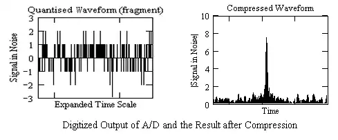Consider, as an example, a chirp signal with time-bandwidth product of 200 and of amplitude of ½ LSB which is embedded in noise with an rms voltage of 1 LSB, present at the input to an A/D. he digitized, quantised output, relative to the mean value, is similar to the example in the left-hand figure below. After compression in the signal processor, a high amplitude pulse, whose magnitude is well above the noise is obtained, as shown in the right-hand figure.