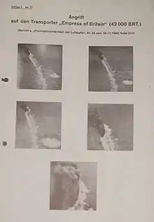 At around 9:20 am on 26 October 1940, travelling about 70 miles northwest of Ireland along the west coast, Empress of Britain was spotted by a German Focke-Wulf Fw 200C Condor long-range bomber, commanded by Oberleutnant Bernhard Jope. Jope's bomber strafed Empress of Britain three times and struck her twice with 250 kg (550 lb) bombs.