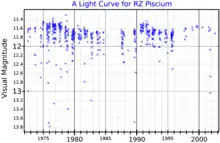 RZ Piscium (or RZ Psc) is a UX Orionis type variable star[7] 608 light-years (186 pc) away, in the constellation Pisces.[2] Over the years, the star has been found to brighten and dim erratically, dimming by as much as a tenth of its usual luminosity.[11] RZ Piscium has been found to emit large amounts of infrared radiation,[9] suggesting the presence of a substantial mass of gas and dust orbiting the star, possibly from a "disrupted planet".[6][12]