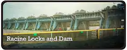 Racine Lock and Dam is the ninth lock and dam on the Ohio River. It is located 238 miles downstream from Pittsburgh. There are two locks, one for commercial barge traffic 1,200 feet long by 110 feet wide, and the auxiliary lock, which is 600 feet long by 110 feet wide.[1]