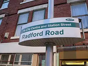 Radford Road is a tram stop on the Nottingham Express Transit network, serving the suburb of Hyson Green, City of Nottingham in Nottinghamshire, England.