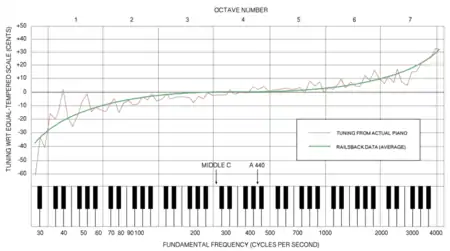 The Railsback curve, first measured by O.L. Railsback, expresses the difference between normal piano tuning and an equal-tempered scale (one in which the frequencies of successive notes are related by a constant ratio, equal to the twelfth root of two). For any given note on the piano, the deviation between the normal pitch of that note and its equal-tempered pitch is given in cents (hundredths of a semitone).