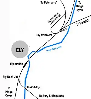 Ely Dock Junction is just under a mile south of Ely station 52°23′04″N 0°15′40″E / 52.38458°N 0.26101°E on the London-King's Lynn main line. From the junction, the non-electrified single-track Ely to Ipswich line diverges to the southeast. The line serves Newmarket, Bury St Edmunds and Ipswich where it connects with the ex-GER main line from London Liverpool Street station to Norwich.