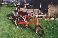 The Chopper was designed in response to the Schwinn Sting-Ray,[7][8] and an earlier attempt, the Rodeo, which was not commercially successful.[8] The popularity of the Chopper also led to a range of smaller bikes following a similar design theme. These included the Raleigh Chipper, Tomahawk and Budgie models, aimed at younger riders.[11]