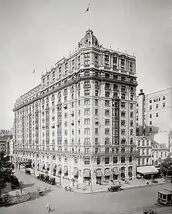 In 1911, the building was razed and rebuilt by architect Henry Janeway Hardenbergh as a 13-story Beaux Arts hotel with a rusticated brick, white limestone, and terra cotta exterior.[2] Congress changed the height limit for buildings on Pennsylvania Avenue NW from 130 feet (40 m) to 160 feet (49 m) in 1910 in order to accommodate the Raleigh Hotel.[2] In 1936, there was a major interior renovation. Curt Schliffeler managed the hotel from 1936 to 1954. In 1964, the Raleigh was demolished.[3]