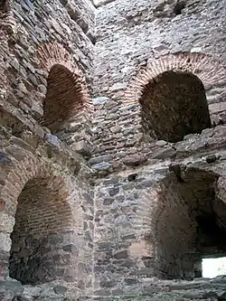 Masonry fireplaces, rare in the medieval buildings of this region, are preserved in them. These furnaces were discovered during the archaeological surveys and each had its own chimney built into the walls. The toilet, specifically built for the commander of the fortress, was also discovered.[11] Over city's moat lies a bridge which is located at the southeastern tower, and that leads to a space between the fortress and the low walls around it. On all the ramparts except the West one, the embrasures are placed at the same distance from the tower.[2][14]
