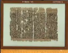 The Ramesseum magician's box is a container discovered in 1885–1886 in a tomb underneath the Ramesseum by Flinders Petrie and James Quibell, containing papyri and items related to magical practices.[1]