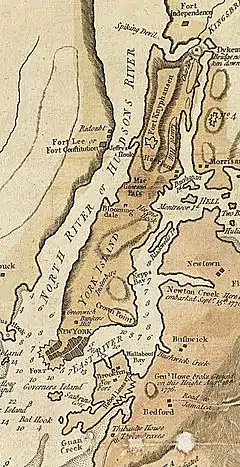 A 1781 British map of Manhattan. Montresor's (Wards) and Buchanan's (Randalls) Islands can be seen on the right, flanking Hell Gate, although their names have been reversed, Montresor's being the northern of the two.