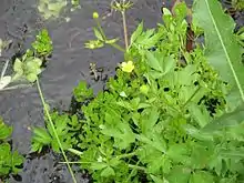 Ranunculus macounii is a species of buttercup known by the common name Macoun's buttercup.[1] It is native to much of North America, from Alaska and northwestern Canada to Newfoundland and Labrador, and the contiguous United States except for the northeast and southeastern areas. It grows in many types of moist habitat, including marshes and wet areas woodlands and scrub. It is generally semi-aquatic, growing in or next to shallow water, or in muddy places. It is a perennial herb producing prostrate, spreading stems that root at nodes that come in contact with moist substrate, or growing erect and branching. The stems are generally hairy, but populations of hairless specimens are known. The leaves are mostly divided into three lobed, toothed leaflets which are borne on long, hairy petioles. The flowers each have five shiny yellow petals under a centimeter long around a center of many stamens and pistils. The fruit is an achene borne in a spherical cluster of 20 or more.
