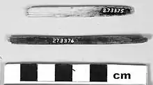 The tattooing process was performed with bone needles and combs called uhi or iuhi made out of bird or fish bones.[3][4] The ink was made out of natural products, primarily from the burning of Ti leaves (Cordyline terminalis) and sugar cane.[5][3] The other end has two grooves so that a rod can be attached to the end, which probably helps the artist maneuver the needles during the tattoo process.[3] Tattoos are applied with the needle combs and a wooden mallet called miro pua ‘uhi.[6]