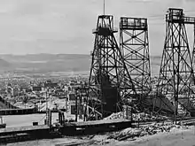 Headframes of the Anaconda Copper Mining Company, looking over the town of Butte, MT