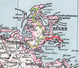 The first stretch of the line that was opened, running from Putbus to Binz and still in service today, began operations on 22 July 1895. The operator, Rügensche Kleinbahn-Aktiengesellschaft (RüKB), had extended its network to 104.82 km by 21 December 1896. One part went from Altefähr railway station, opposite Stralsund, by way of Putbus to Göhren. The other part led from Altenkirchen near Cape Arkona to Bergen by way of the Wittow Ferry; however, the ferry there that joined two stretches of line on separate lobes of Rügen normally only carried goods wagons, and passengers had to transfer on foot. The bulk of the lines were abandoned on 3 December 1967, on 10 September 1968 and on 20 January 1970.[2]