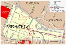 Ratchathewi (Thai: ราชเทวี, pronounced [râːt.t͡ɕʰā.tʰēː.wīː]) is a district (khet) in central Bangkok, Thailand. Clockwise from the north, its neighboring districts are Phaya Thai, Din Daeng, Huai Khwang, Watthana, Pathum Wan and Dusit.