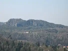 The Rauenstein is a table hill in Saxon Switzerland in Germany. It rises west of the Elbe inside the Elbe loop near Rathen. It has a height of 304 metres (997 feet) and drops steeply to the north into the Elbe valley. It has a deeply incised structure and is about 600 metres (2,000 feet) long and 200 metres (660 feet) wide. It thus rises almost 100 metres (330 feet) over the surrounding area. The Rauenstein is almost completely wooded, but has several dominant sandstone rock faces. The sandstone here is very soft and heavily weathered.