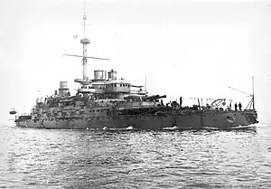 For their first decade in service, all three ships saw duty in the Active Squadron of the Italian fleet, though their early careers were uneventful. Re Umberto and Sardegna made visits to Britain and Germany in 1895, the latter for the opening of the Kaiser Wilhelm Canal.[8][9] The ships were involved in an international naval demonstration off Crete in 1897 before the Greco-Turkish War.[10] In 1905, all three ships were transferred to the Reserve Squadron,[11] having been supplanted by the more modern pre-dreadnought battleships of the Ammiraglio di Saint Bon and Regina Margherita classes.[12]