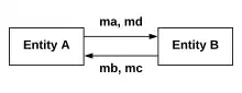 As an example, we consider the system of two protocol entities that exchange the messages ma, mb, mc and md with one another, as shown in the first diagram. The protocol is defined by the behavior of the two entities, which is given in the second diagram in the form of two state machines. Here the symbol "!" means sending a message, and "?" means consuming a received message. The initial states are the states "1".