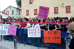 One of the earliest Israeli demonstrations (31 May 2010). Demonstrators in front of Israeli Defence Ministry protest against IDF actions toward "Flotilla". Signs read in Hebrew "IDF-terror in uniform" and "Israel-state of terror".