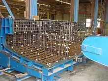 A rebar spacer is a device that secures the reinforcing steel or "rebar" in reinforced concrete structures as the rebar is assembled in place before the final concrete pour. The spacers are left in place during the pouring to keep the rebars in place. After the pour, the spacers become a part of the structure.