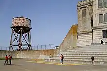 The Recreation Yard was the yard used by inmates of Alcatraz Federal Penitentiary between 1934 and 1963. It is located adjacent to the Dining Hall northwest of the end of D-Block on a raised level surrounded by a high wall and fence above it.[1][2] Guard Tower #3 lay just to the west of the yard.[3] The gun gallery was situated in the yard, mounted on one of the dining hall's exterior walls.[4] The recreation yard faced the mainland.[5]