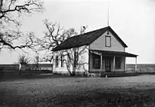 The school was the Red Bank School, whose location in the district varied over the years, but in 1891 was just east of the road that connects Lowrey Road with Red Bank Road.[1] It finally closed in 1962.[1] Red Bank School was one of nine one-room schoolhouses in Tehama County in the early 20th century.[8] A former student described the school as a white-shingled building near the creek; inside was a potbelly stove "and a wash basin to hold water from the well, which students used dippers to drink from".[8]
