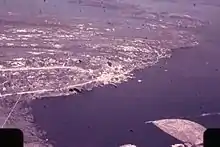 Aerial view of Red Lake 1936. Log boom full of saw logs at McDougall's Sawmill is visible at bottom right.