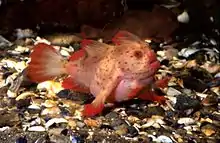 The red handfish is distinguished by its small, flattened wart-like protuberances that cover its body and red colouration. Two colour morphs exist, a bright red morph with red colour on both body and fins, with a black line separating the white fin edges and a mottled morph with pink body covered in many red patches, with translucent pink fins expressing some bright red patches. They measure an average standard length of 61.4 mm (2.4 in) and an average total length of 80.1 mm (3.2 in).[2] They use their hand-like fins to crawl rather than swim.[3]