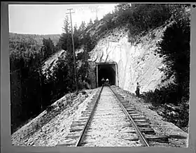 During early times, passenger trains would stop at points of interest like this one for passengers to alight and view the natural wonder. The catchment lake for the Mica Dam submerged this feature in the early 1970s, and required a track diversion, which replaced the sharp track bend known as "Calamity Curve", and added a further tunnel at a higher elevation. The water level now peaks a few feet lower than Redgrave.[5] A decade later, further realignment reduced track curvature with another diversion, added 910 metres (2,970 ft) of new track, extended the siding, and removed about 300 metres (1,000 ft) of the earliest tunnel. Previously, trains had to reduce from 56 kilometres per hour (35 mph) to 40 kilometres per hour (25 mph) on entering that tunnel.[10]