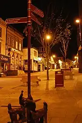 Redruth's Fore Street at night, showing one of the groups of bronze 'dogs'.