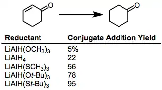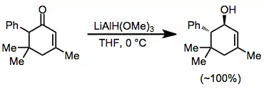 α,β-Unsaturated ketones may be reduced selectively in a 1,2 or 1,4 sense by a judicious choice of reducing agent. Use of relatively unhindered lithium trimethoxyaluminium hydride results in nearly quantitative direct addition to the carbonyl group (Eq. (9)).[21] On the other hand, use of the bulky reagent LTBA leads to a high yield of the conjugate addition product (Eq. (10)).[22]