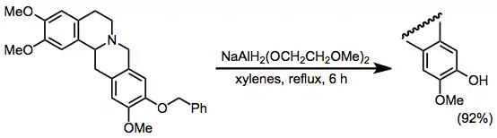 Ether cleavage is difficult to accomplish with most hydride reagents. However, debenzylation of benzyl aryl ethers may be accomplished with SMEAH.[23] This protocol is a useful alternative to methods requiring acid or hydrogenolysis (e.g., Pd/C and hydrogen gas).