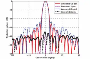 Simulated and measured radiation patterns of a reflectarray antenna operating at 12.5 GHz.[1]