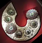 Barmas of Old Ryazan were produced by masters of Old Ryazan in late 12th - early 13th century. They are one of the greatest masterpieces of ancient jewellery. The barmas belonged to the local knyaz family, but in 1237 the city was completely destroyed by Batu Khan, so the forsaken jewellery laid underground for nearly 600 years. In 1822, the royal barmas were found by archeologists and brought to the Kremlin Armory. These precious barmas are the high-craft masterpieces, enamelled and encrusted with gems. Some of the barmas have gold medallions with engravings in Greek, presumably of the Byzantine origin.