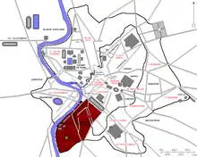 Regio XIII not only contained the Aventine Hill, but also the plain in front of it.[1] In extent, this region was bordered by the Tiber River to the west, the Circus Maximus to the north, the Vicus Piscinae Publicae and the Via Ostiensis to the east, and the Aurelian Walls to the south. Its principal gate through the walls was the Porta Ostiensis. A measurement taken at the end of the 4th century recorded that the perimeter of the region was 18,000 Roman feet (approximately 5.3 km).[2]