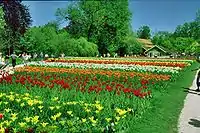 From 1980 to 2000, the "large horticultural shows" were held annually in Baden-Württemberg. Since 2001, they have been held annually, alternating with the "small state garden shows", the so-called green projects.[2] For green projects, the state provides a subsidy of a maximum of two million euros for green projects and a maximum of five million euros for state horticultural shows, whereby the municipalities also have to make corresponding contributions of their own.[3] By 2010, the state has granted almost 80 million euros in state subsidies. This has resulted in at least three times and in some cases even seven times the amount of investment on the part of the municipalities; they invested around 153 million euros: In the process, around 625 hectares of green spaces were created, redesigned and permanently secured. The State Horticultural Shows and green projects provide the impetus for comprehensive structural developments that create a spirit of optimism in the municipalities and strengthen their economic development. An expert commission will evaluate the applications and assess the submitted concepts on site. The Council of Ministers then awards the state garden shows and green projects in a cabinet meeting.