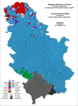 About 1.1% of the Serbian population is atheist. Religiosity was lowest in Novi Beograd, with 3.5% of population being atheists (compare to whole of Belgrade's and Novi Sad's 1.5%) and highest in rural parts of the country, where atheism in most municipalities went below 0.01%.[8]