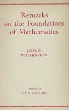 Remarks on the Foundations of Mathematics (German: Bemerkungen über die Grundlagen der Mathematik) is a book of Ludwig Wittgenstein's notes on the philosophy of mathematics. It has been translated from German to English by G.E.M. Anscombe, edited by G.H. von Wright and Rush Rhees,[1] and published first in 1956. The text has been produced from passages in various sources by selection and editing. The notes have been written during the years 1937–1944 and a few passages are incorporated in the Philosophical Investigations which were composed later. When the book appeared it received many negative reviews[2] mostly from working logicians and mathematicians, among them Michael Dummett, Paul Bernays, and Georg Kreisel.[3] Today Remarks on the Foundations of Mathematics is read mostly by philosophers sympathetic to Wittgenstein and they tend to adopt a more positive stance.[4]