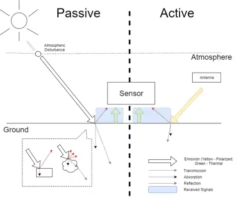Since the sensors are looking through the atmosphere to reach the target, there are atmospheric absorption. Three main atmospheric windows, which allow penetration of radiation, can be identified.[1] They are 0.4–3 micro-meters (Visible and Near-Infrared (VNIR)), 3–14 micro-meters (Thermal Infrared TIR) and few millimeters to meters (microwave).[7] Camera in everyday life is a passive imaging system in VNIR wavelength region.[1] A simple classification of prevailing remote sensing instruments in geology, modified from Rees (2013) in accordance with context of this page.[1][7] Text in [ ] refers to the related instruments.