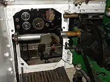 To reduce the height of the vehicle it was made impossible for the crew members to retract their heads under the roof. To protect these vital parts two hemispherical armoured hoods (calottes) were fitted. These had vision slits but to improve the field of vision the front section of these hoods can like a visor be pivoted backwards over the back section. As otherwise a bar between the roof and the glacis would have hindered entrance, the forward hinging glacis hatches had an extension forming the roof section that fits around the front part of the hood; if the hood is retracted and the hatch opened, a larger entry space was thus available. An interesting feature of the vehicle was the internal communication system used. When the hoods were closed, the two crewmen, separated by the engine between them, could not directly communicate; neither internal nor external radio communications were possible, as there were no radio sets fitted. A system of white, blue, green and red lights, that could be made to shine continuously or flicker, was used by the commander to direct the driver when buttoned up, based on a predetermined signal code: