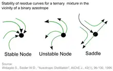 1. Stable node: This is the pure component or the azeotropic point with the highest boiling temperature and lowest vapor pressure in a distillation region. All residue curves end at stable nodes.