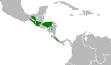 This species inhabits amidst lush vegetation, in specially moist rainforests at high elevations (900–3,200 m (3,000–10,500 ft)).[note 2][1] They populate trees that make up the canopy and subcanopy of the rainforest, though they can also be found in ravines and cliffs.[1] It prefers to live in decaying trees, stumps, and abandoned woodpecker hollows.[1] The vivid colors of the quetzal are disguised by the rainforest.[15] The resplendent quetzal can be found from southern Mexico (southernmost Oaxaca and Chiapas) to western Panama (Chiriquí).[18] The ranges of the two subspecies differ: P. m. mocinno is found in southern Mexico, northern El Salvador, and northwestern Nicaragua, Guatemala and Honduras, while P. m. costaricensis is found in Costa Rica and western Panama.[13] The geographical isolation between the two subspecies is caused by the Nicaraguan depression, a 50 km (31 mi) wide, 600 km (370 mi) long bottomland that contains the two largest lakes in Central America, Lake Managua and Lake Nicaragua, and the deficiency of the breeding habitats in regions adjoining to.[18] The quetzal migrates from its breeding areas in the lower montane rainforest to the pre-montane rainforest on the Pacific slopes for three to four months (July–October), after which they move across the continental divide to the Atlantic slopes.[19]